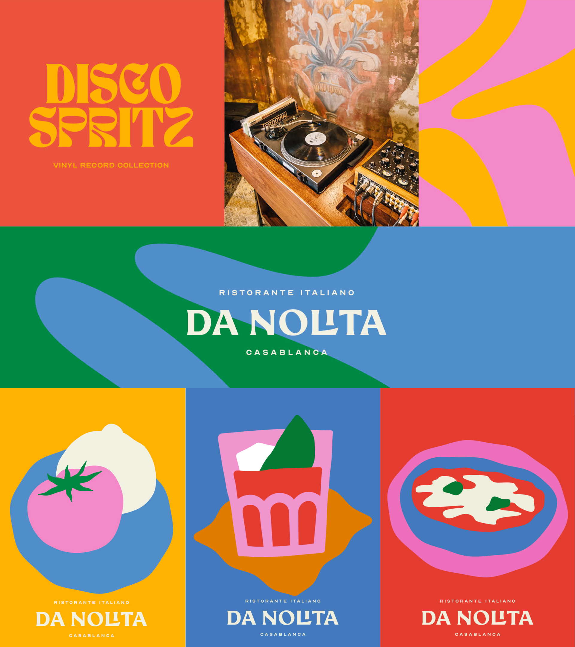 Everything about this rebrand is musical, including the ecstatic color. The vibrant hues highlight the very funk feel, which comes through in the whimsical type; the logo and illustrations, inspired by southern Italy, bring out the Italian influence and a touch of the old-world. The movement captured in the display type and illustrations vibrate with the palette that is attention-grabbing yet comforting, inviting, and—well, dance-y.