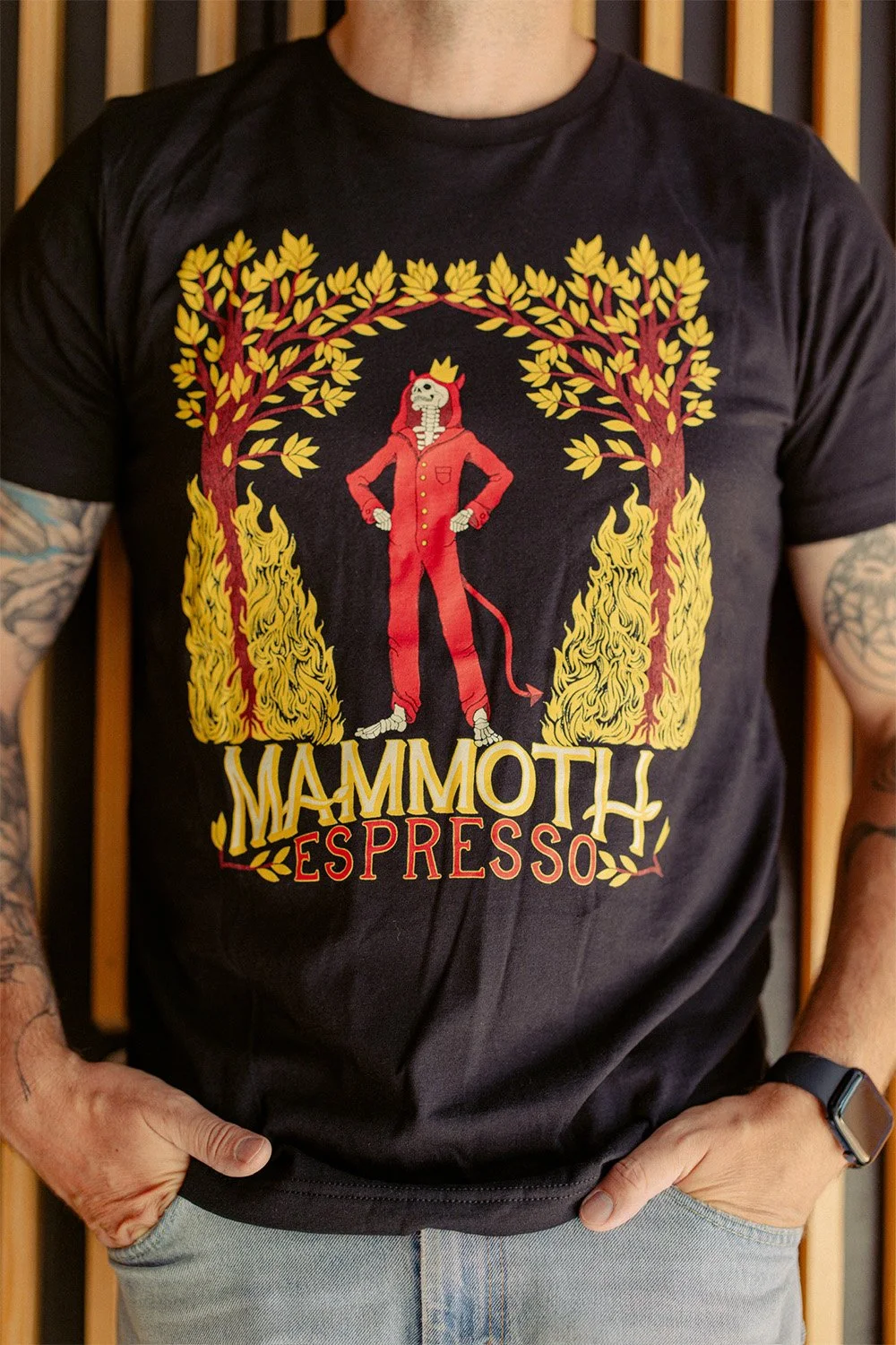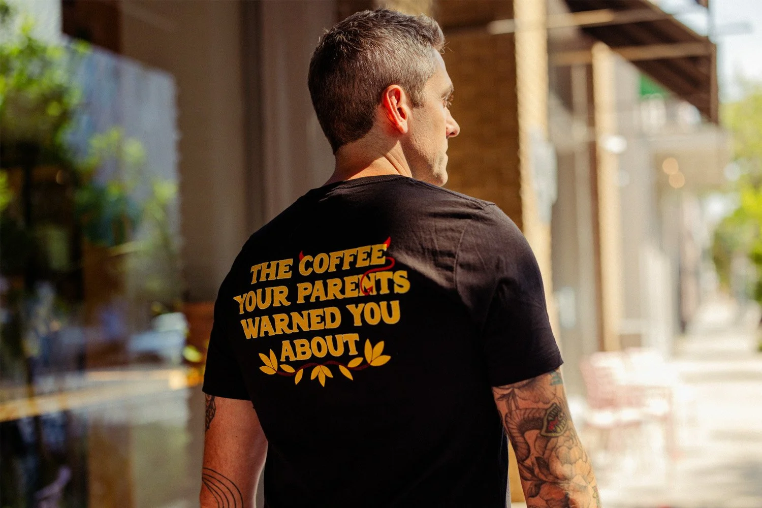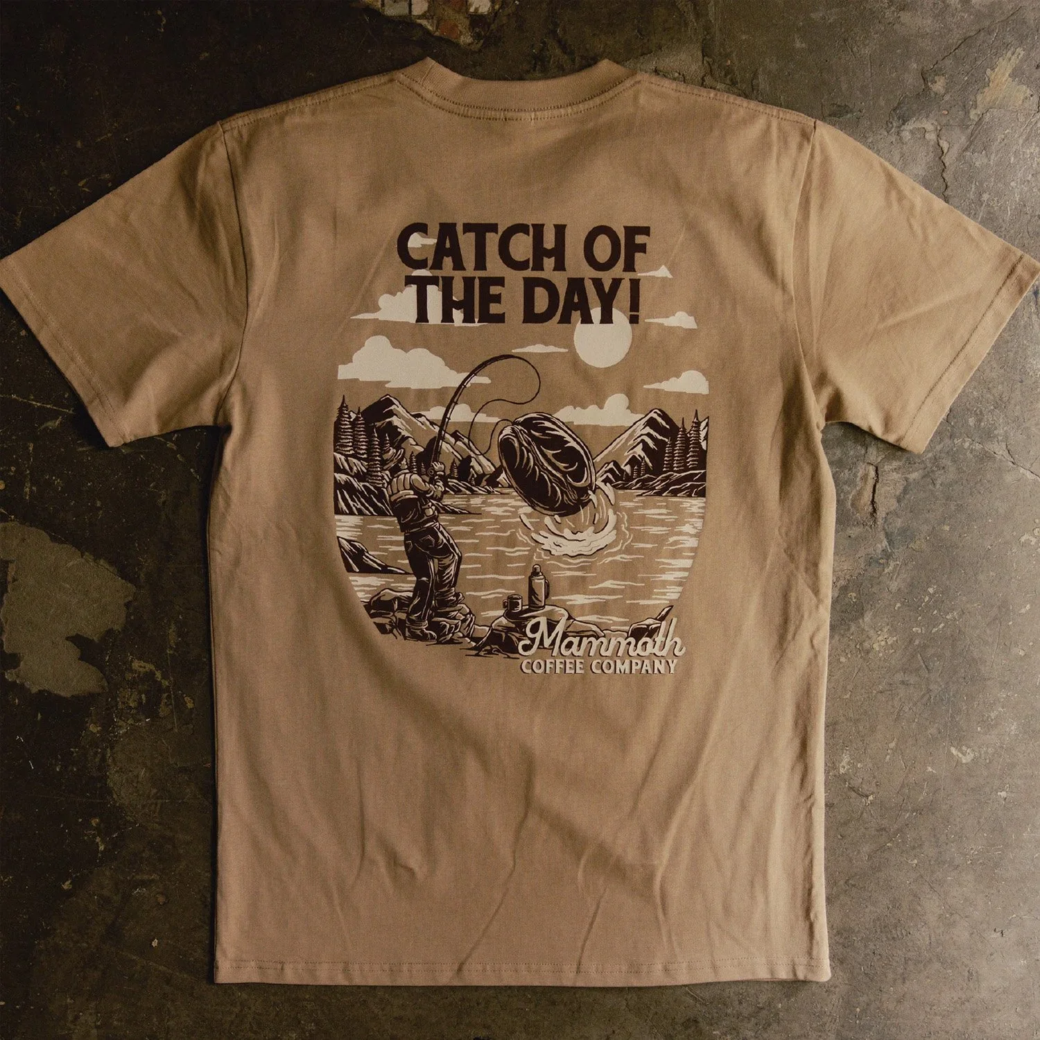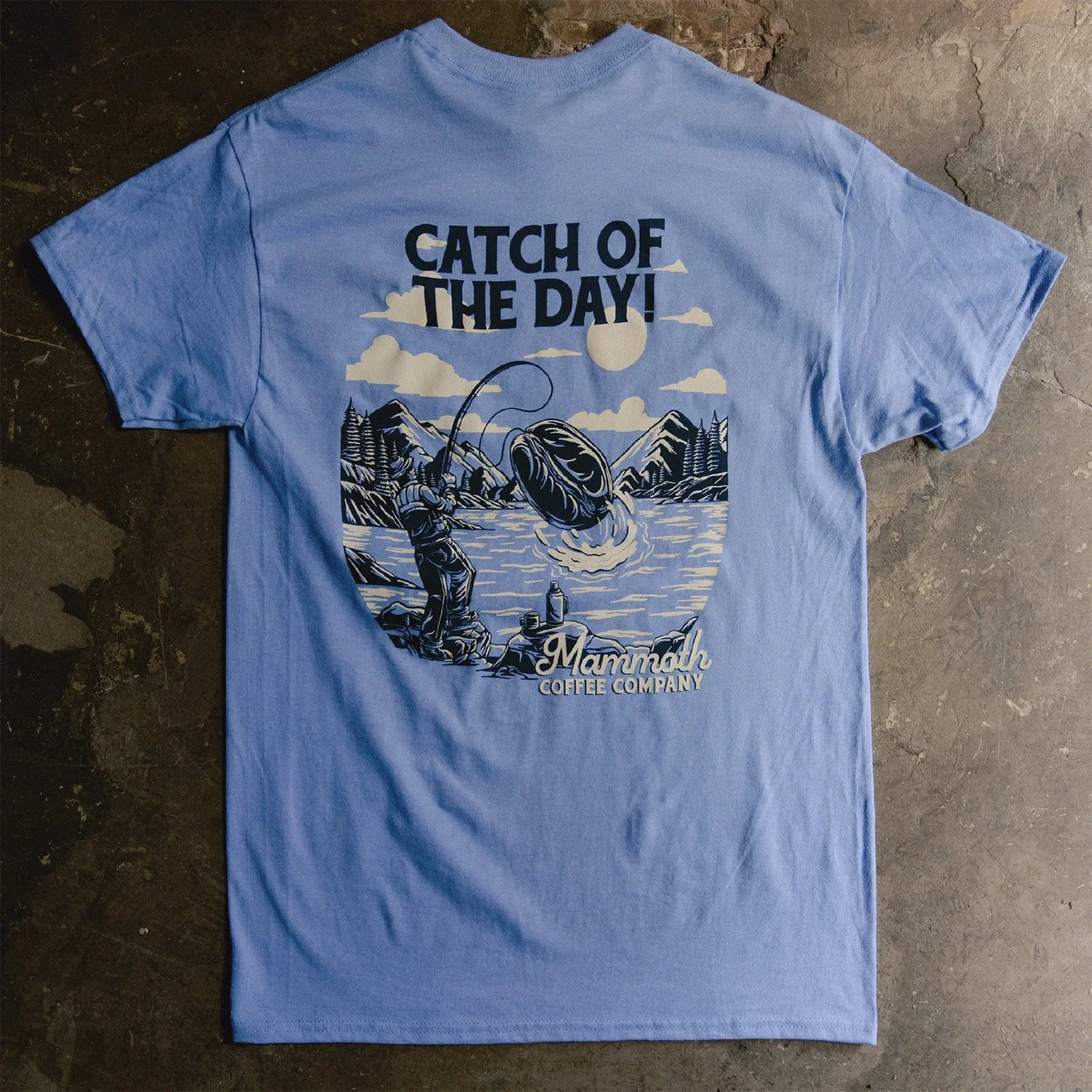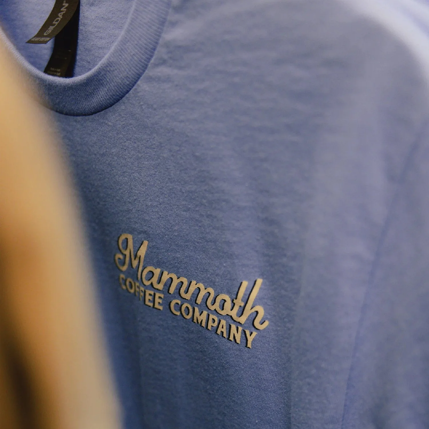 For our most recent collaboration, the team wanted to do to lean into camp and Americana, with a subtle nod to their constantly rotating seasonal coffees and quirky speciality drinks. We settled on a fishing tee for a nostalgic feel. The idea was for the tee to be easily mistaken for an actual fishing shirt from a few yards away. We chose cool, classic colors paired with retro inspired typography for the breast detail.