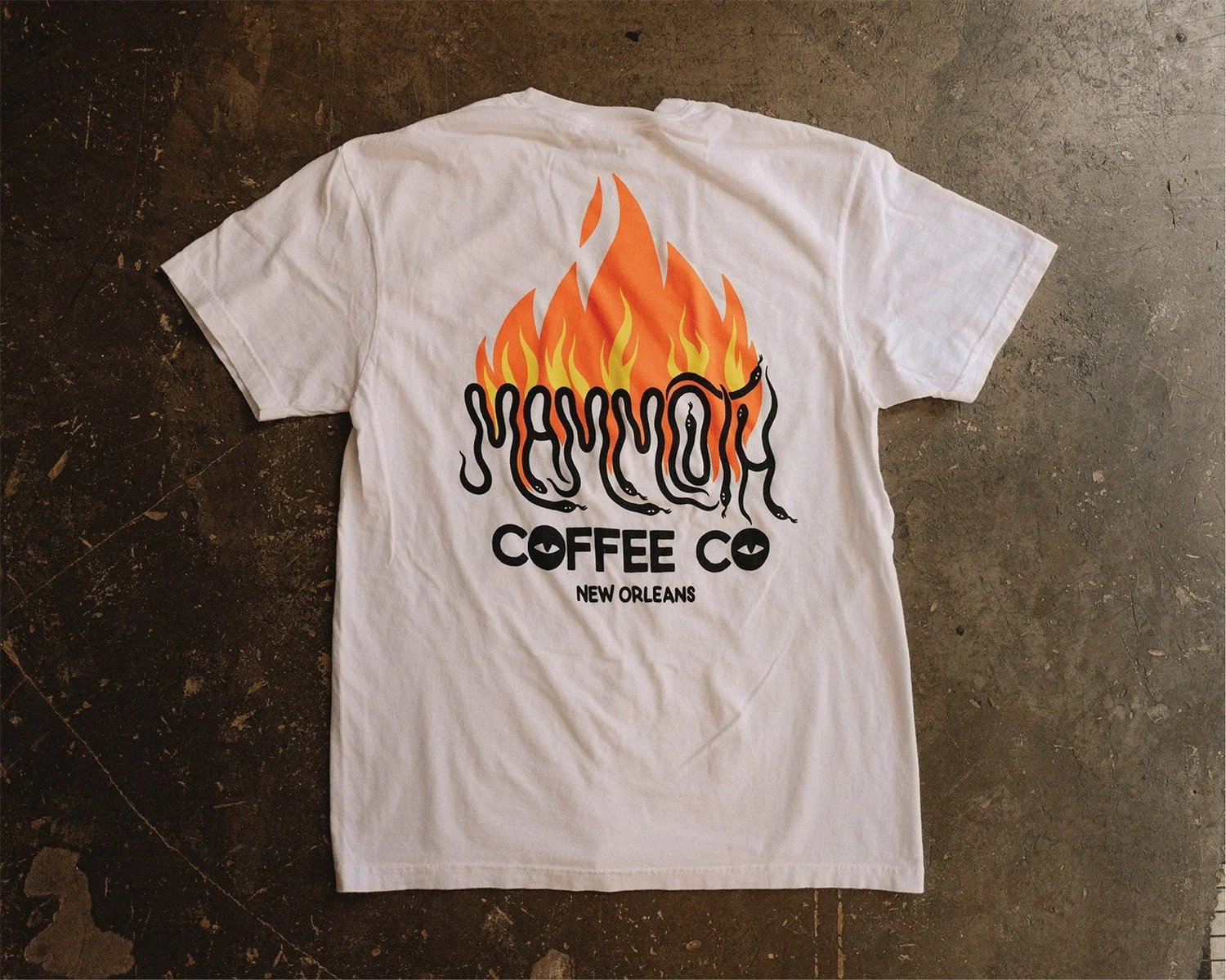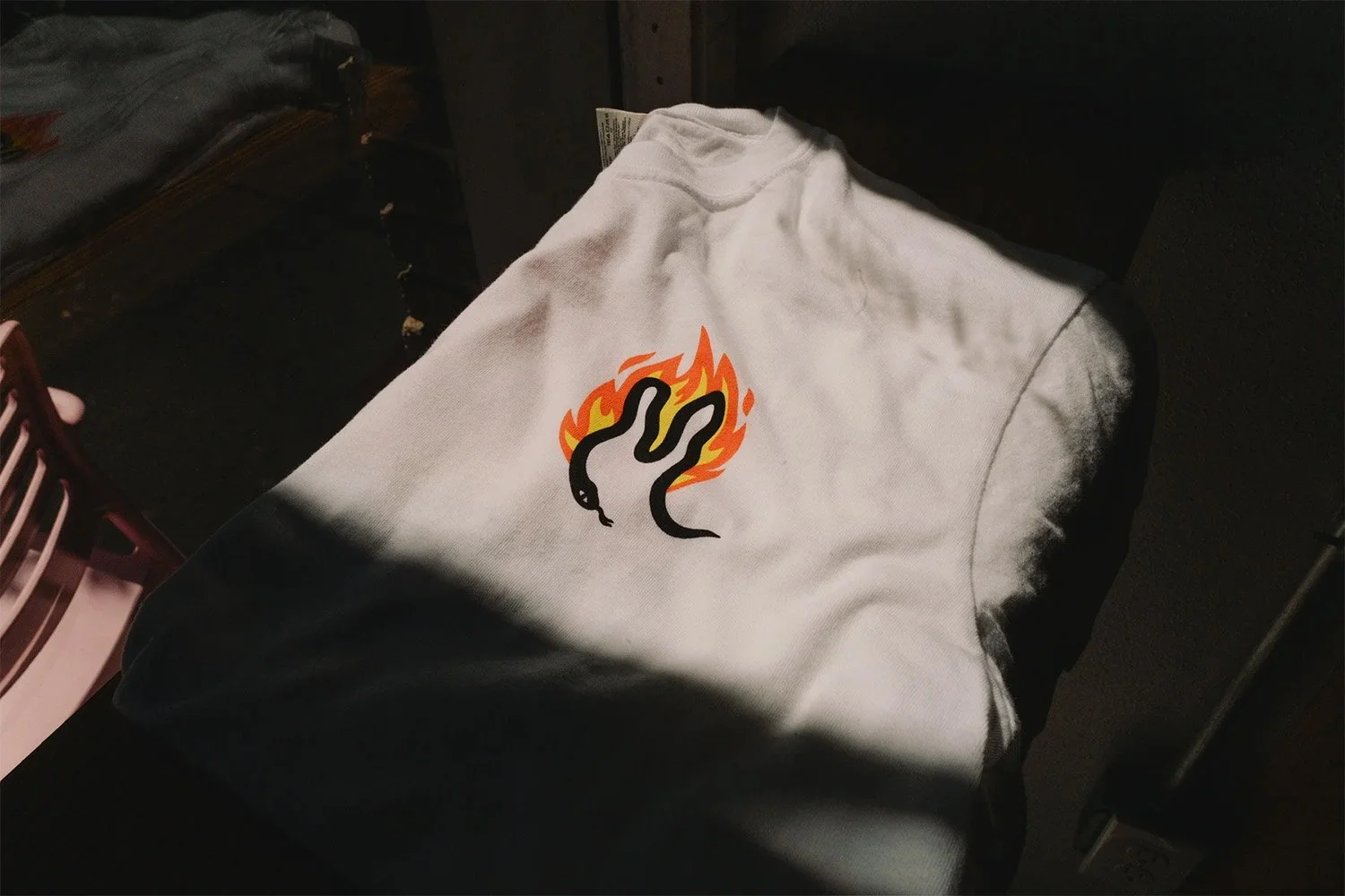 For the second suite, we wanted a simple, graphic image that would work well with the water-based inks of DTG and merge into the fabric without losing detail. The brief was simple: the business name, made of snakes, on fire. What’s not to like?