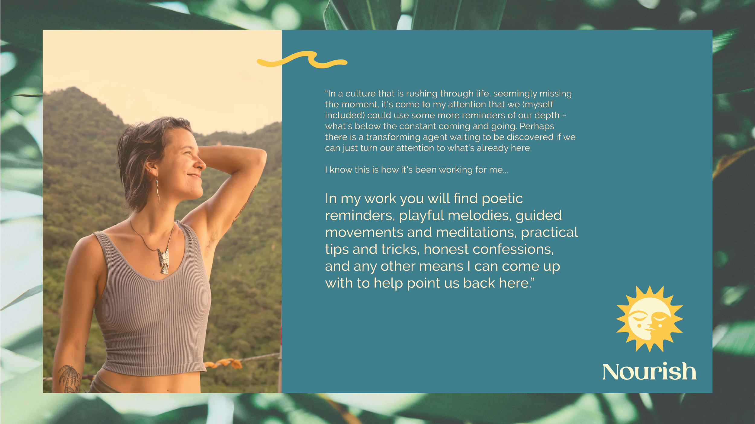 The visual design for Nourish is rooted in and inspired by nature’s rhythms as a metaphor for how the body moves and changes. The idea of “flow” was conceptually important to the brand, which shows up in various design elements: lots of cool blues, wave shapes and icons, and logo/display type that has a curviness to it. We chose vivid colors that represent elements of nature, as well as aspects of the self that are touched by wellness practices. As a mostly online brand, we focused on assets that would accompany video content and a simple, easy to navigate virtual practice space. The sun image in the logo symbolizes awakening and fire, yet her face is calm and meditative, which speaks to the energy and overall feel of the Nourish approach to whole-human wellness.